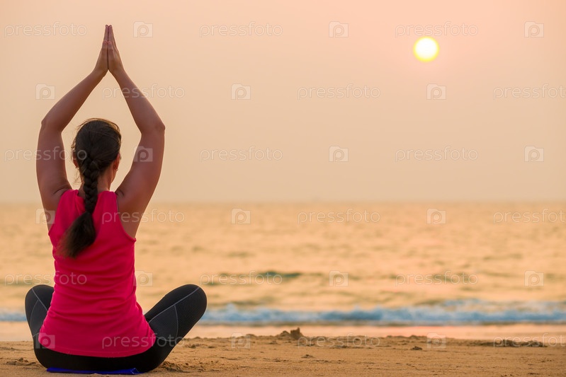 Женщина занимается йогой на пляже
