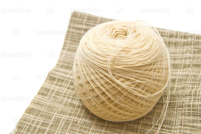 Клубок белой пряжи на ткани крупным планом