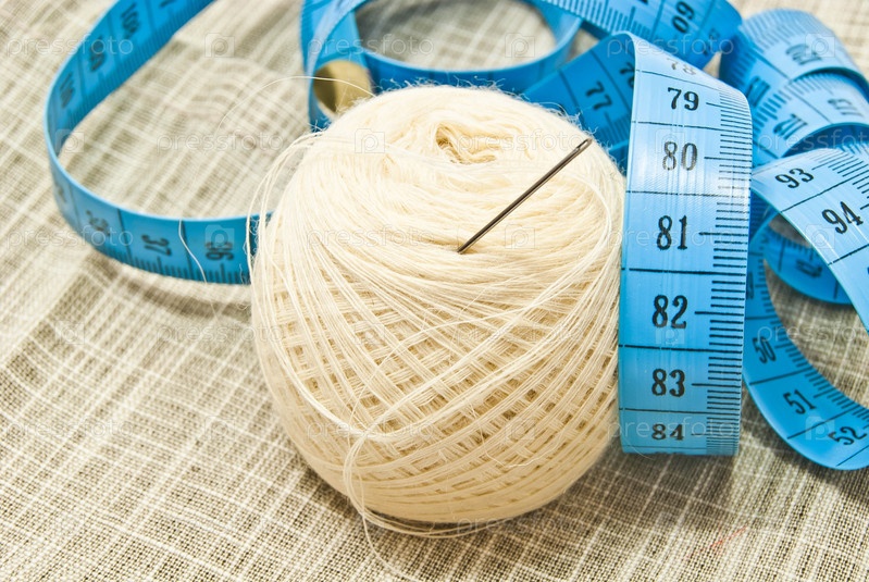 Пряжа с иглой и синий метр крупным планом