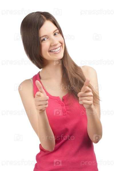Девушка указывает пальцем на зрителя и улыбается, на белом фоне