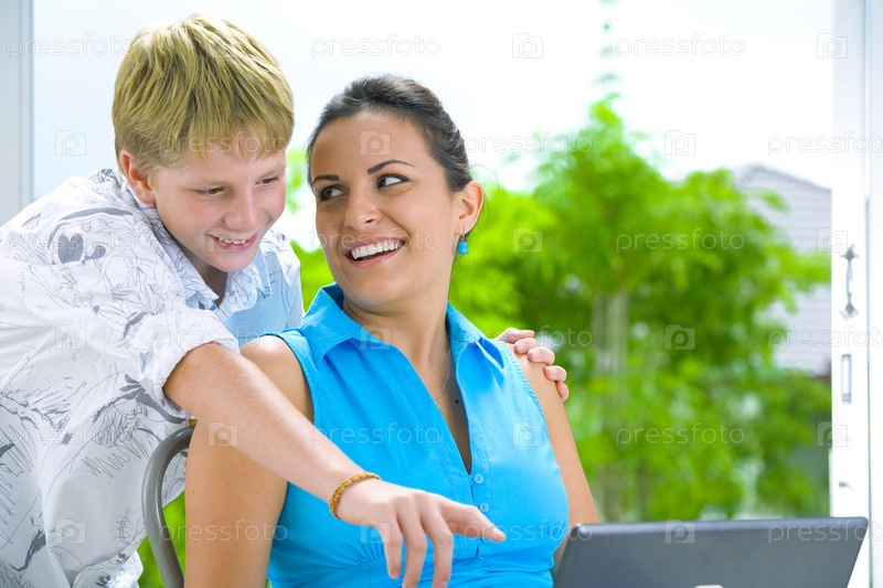 Мать с сыном перед ноутбуком