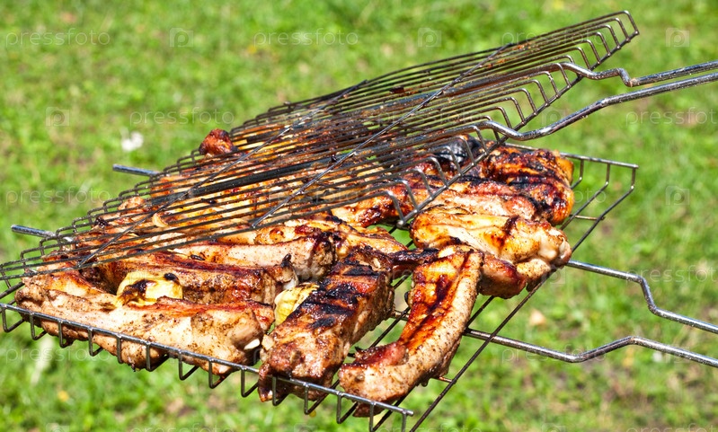 Жареные куриные крылышки и свиные ребрышки на гриле