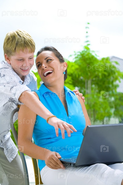 Мать с сыном перед ноутбуком