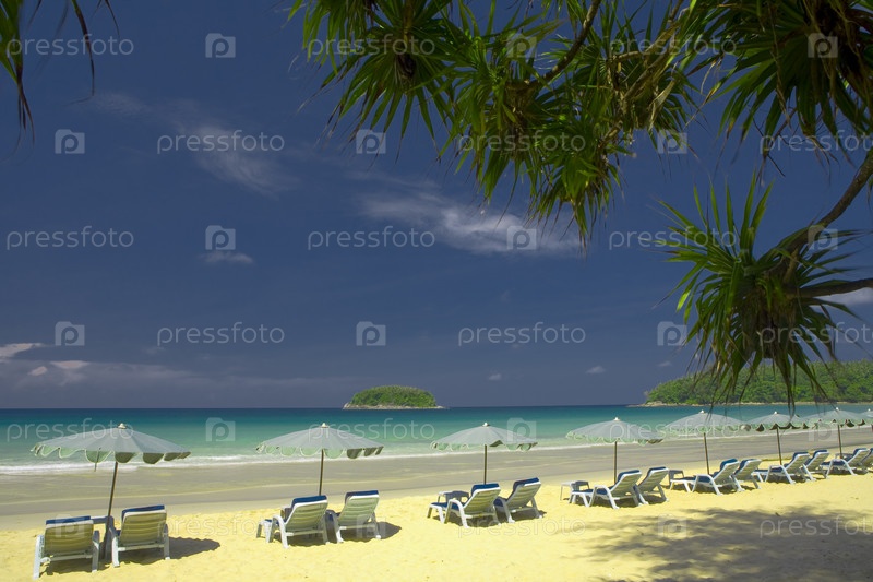 Шезлонги и зонты на тропическом пляже