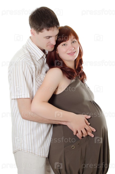 Счастливый муж и беременная жена на белом фоне