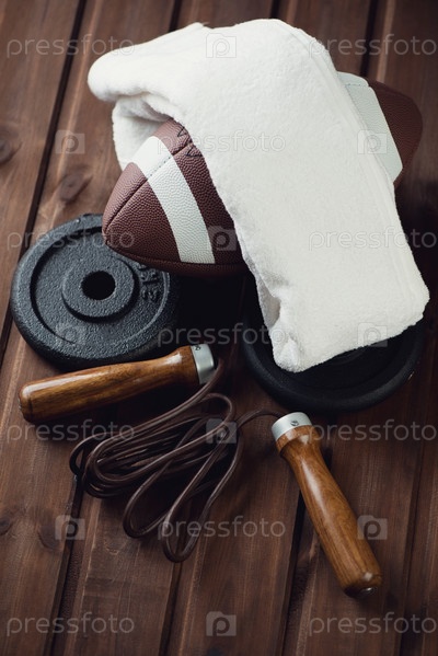 Мяч для американского футбола, скакалка и блины