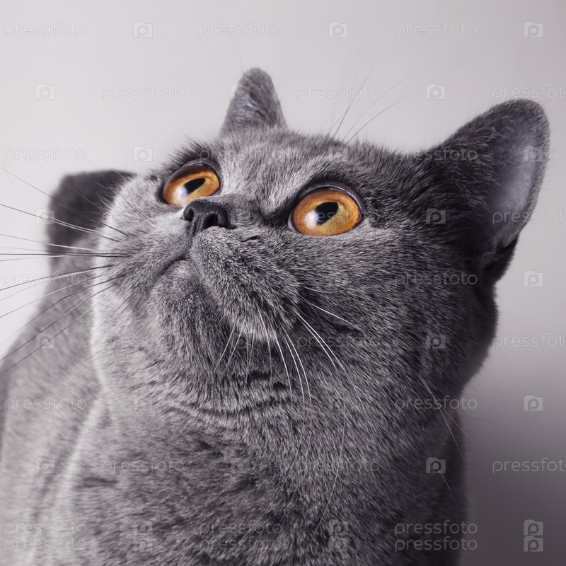 Портрет короткошерстного британского серого кота с желтыми глазами