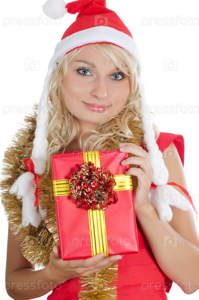 Девушка в колпаке Санта-Клауса с подарком в руках, на белом фоне