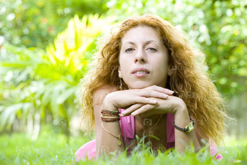 Молодая красивая женщина лежит на траве