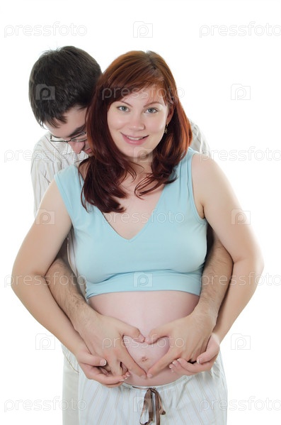 Счастливый муж обнимает беременную жену, изолированы на белом