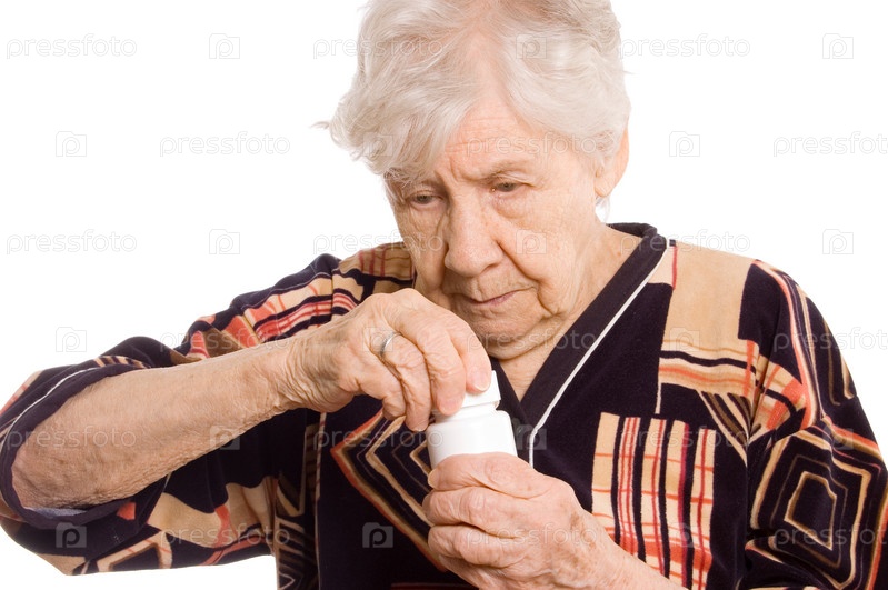 Портрет пожилой женщины с лекарством, изолирована на белом