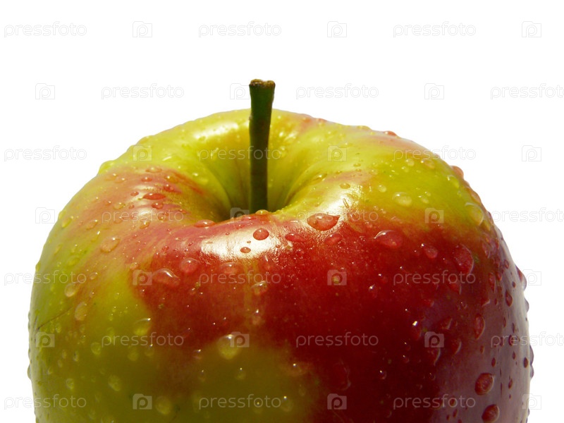 Свежее яблоко с каплями воды на белом фоне