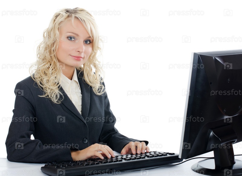Молодая женщина за компьютером, изолирована на белом