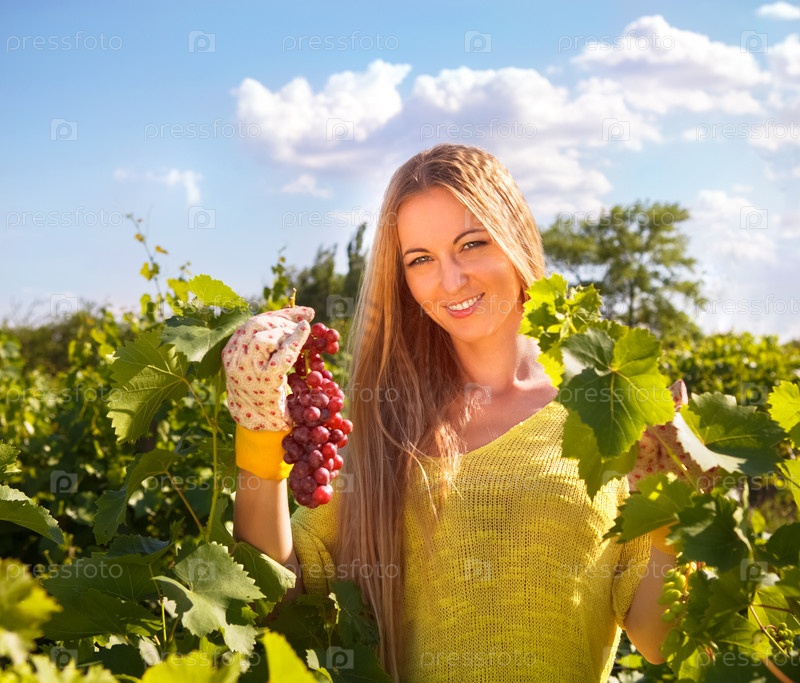 Женщина собирает виноград