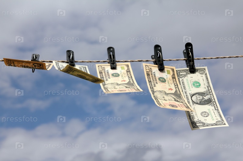 Бумажные доллары сушатся на веревке под голубым небом