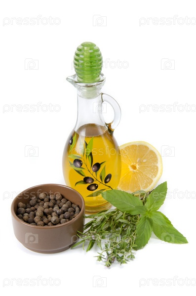 Кувшин с оливковым маслом, лимон, перец и пряные травы на белом фоне