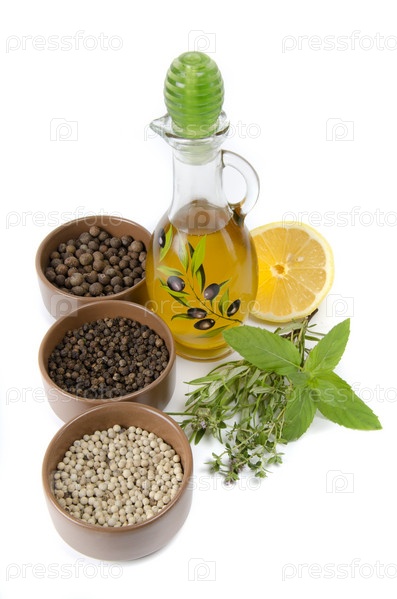 Кувшин с растительным маслом, лимон, перец и пряные травы на белом фоне
