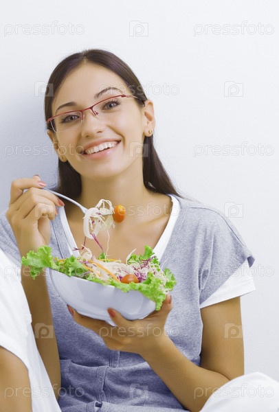Портрет молодой красивой брюнетки с овощным салатом