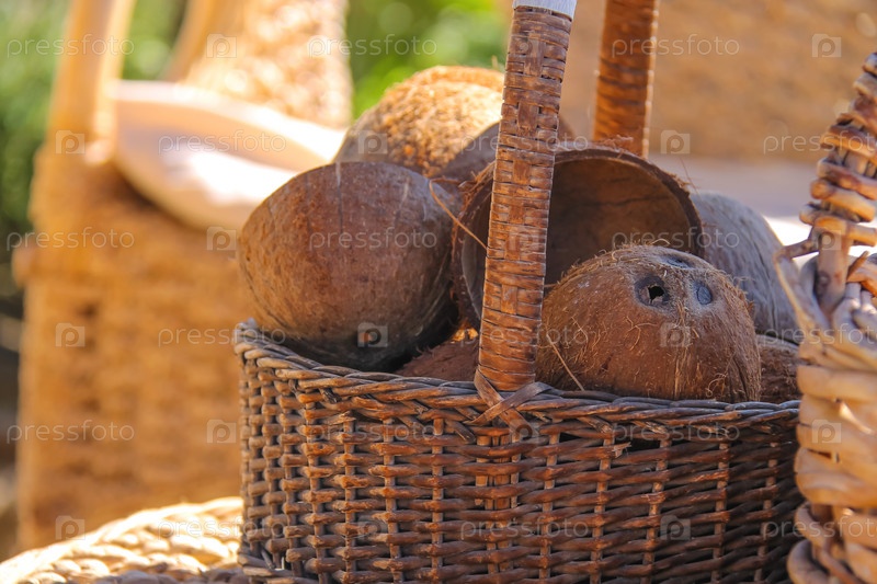 Плетеная мебель и корзина с кокосами на пляже