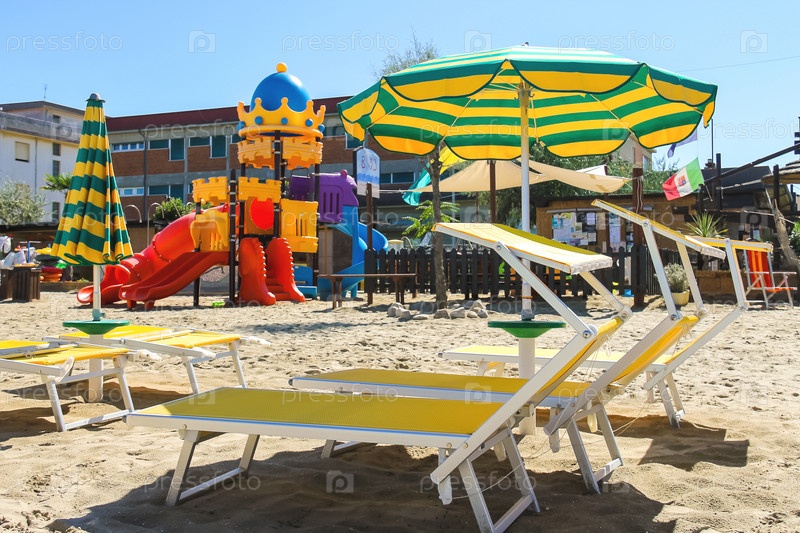 Детская игровая площадка, шезлонги и зонтики на пляже в курортном городке Беллария-Иджеа-Марина, Римини, Италия