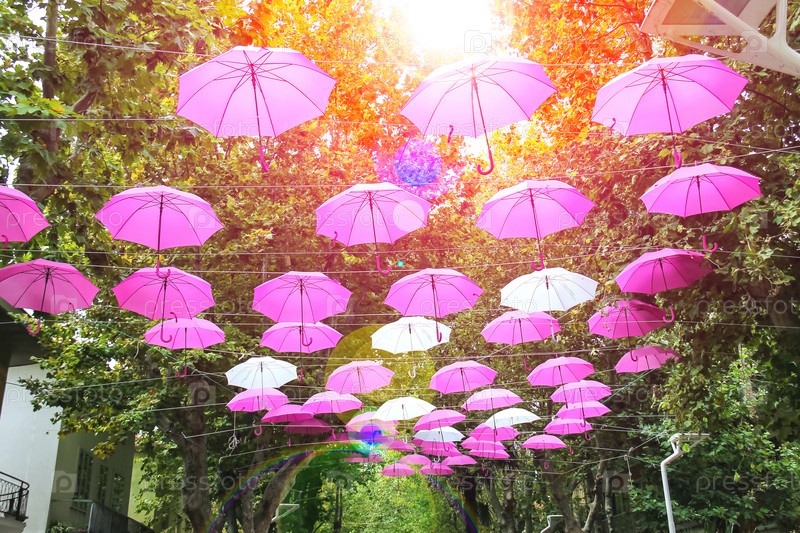 Розовые и белые зонтики украшают улицы в городе-курорте Беллария-Иджеа-Марина, Римини, Италия