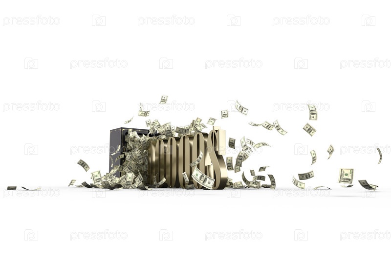 Банковский сейф и летающие купюры на белом фоне