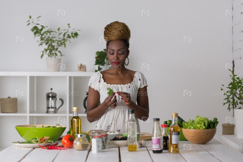 Женщина режет овощи для салата