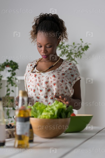 Женщина режет овощи для салата
