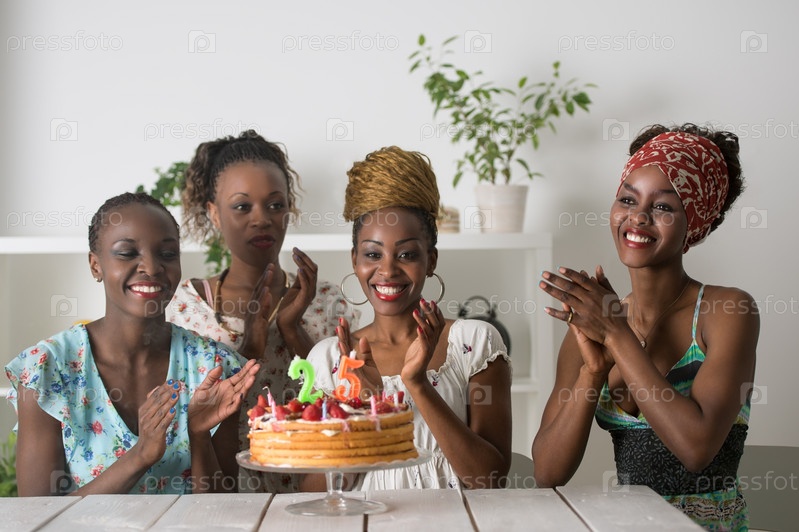 Девушка с именинным тортом в окружении друзей