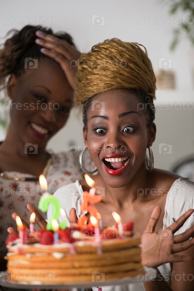 Девушка с именинным тортом в окружении друзей