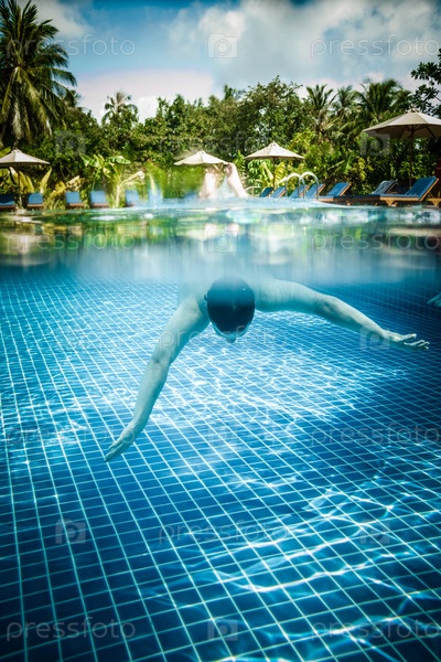 Мужчина плавает под водой в бассейне