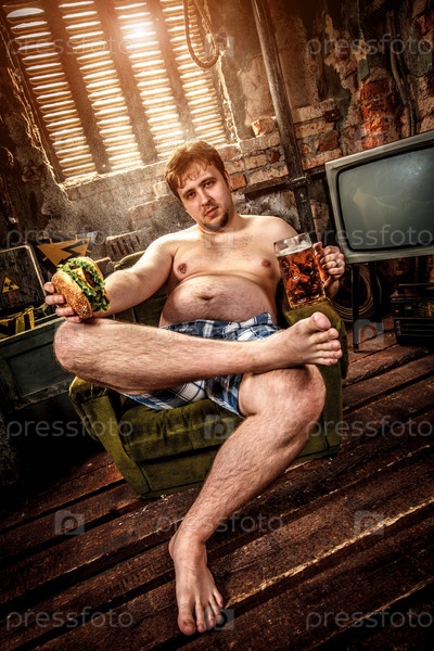 Толстый мужчина ест гамбургер
