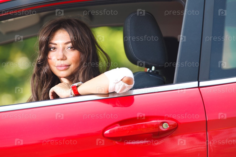 Красивая девушка позирует в красном автомобиле