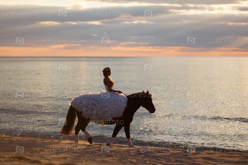 Невеста на лошади на закате на берегу моря