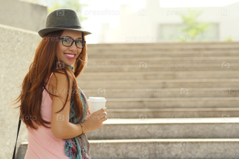 Девушка с кофе на городской улице