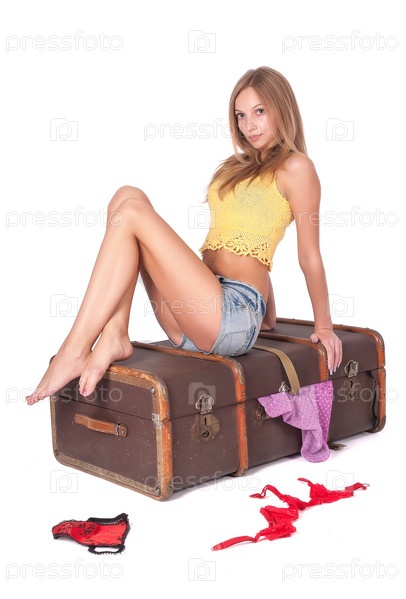 Красивая женщина сидит на старом чемодане