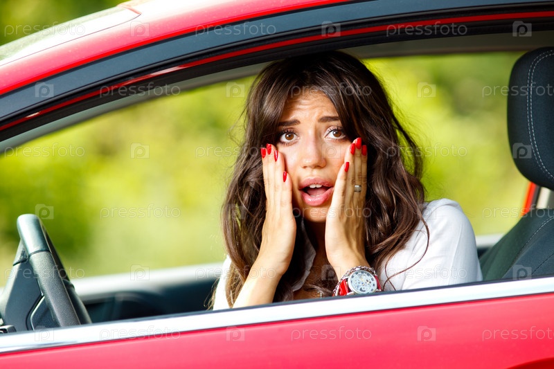 Молодая девушка испуганно смотрит из окна красного автомобиля