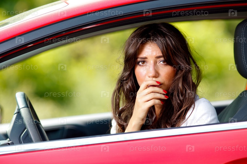 Молодая девушка испуганно смотрит из окна красного автомобиля