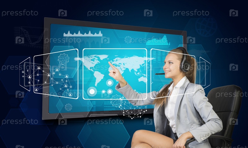 Бизнес-леди нажимает на иконки виртуального интерфейса
