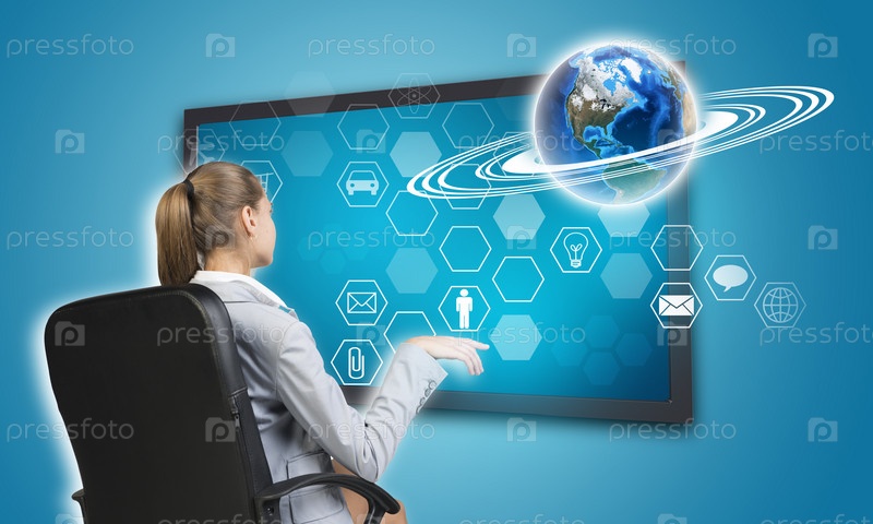 Бизнес-леди нажимает на иконки виртуального интерфейса