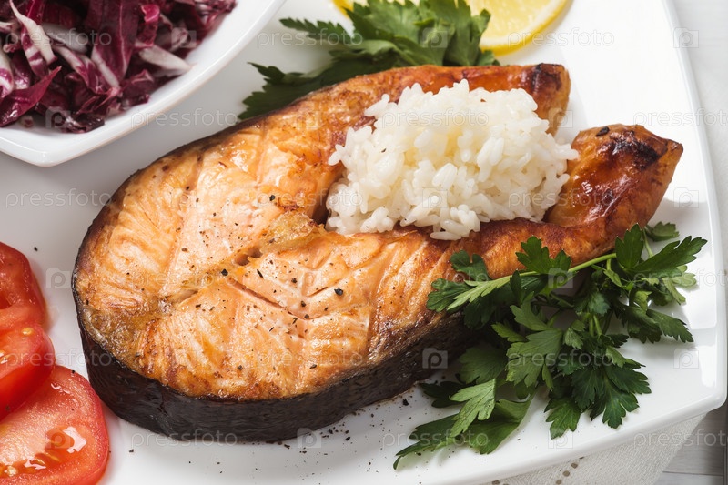 Форель с овощами и рисом крупным планом