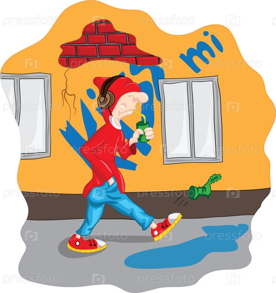 Подросток в наушниках идет по улице и пьет напиток