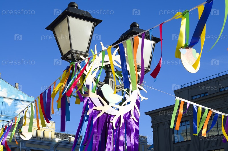 Разноцветные ленты и уличные фонари на фоне голубого неба