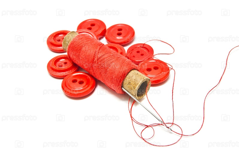 Катушка нитей и пуговицы на белом фоне