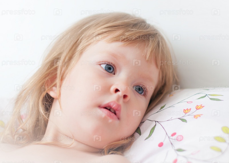 Портрет маленькой светловолосой девочки, лежащей на подушке