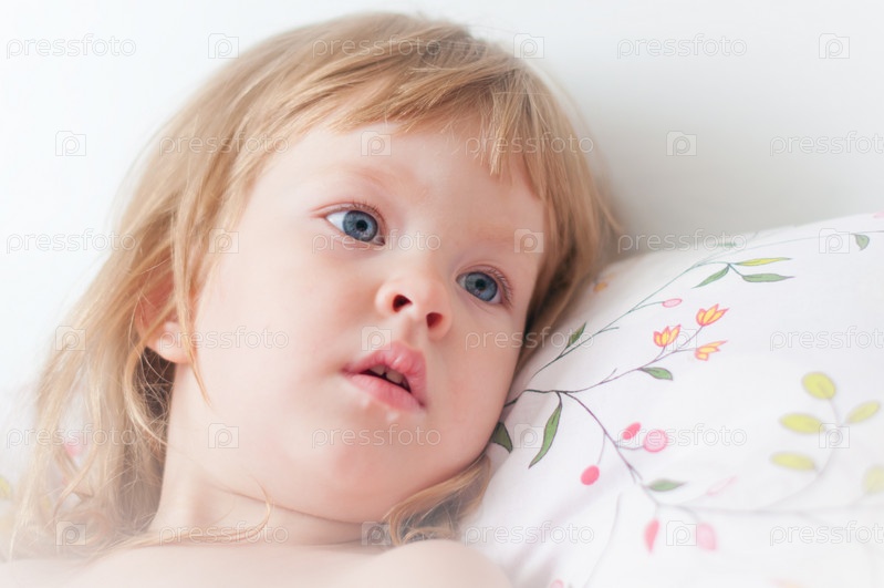 Портрет маленькой светловолосой девочки, лежащей на подушке