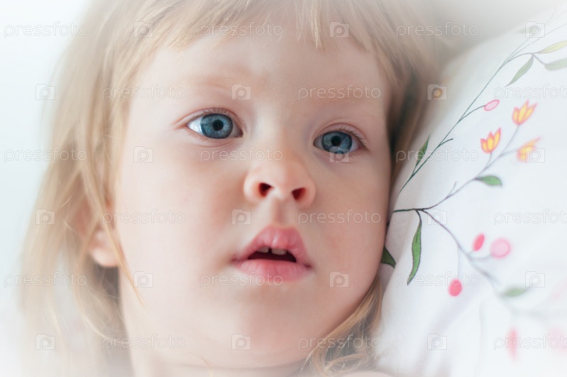 Портрет маленькой светловолосой девочки, лежащей на подушке