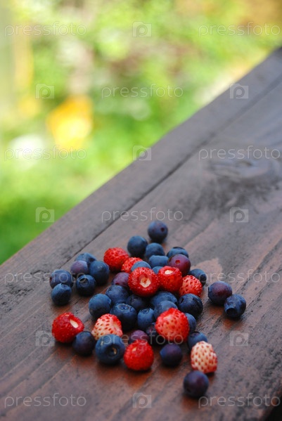 Черника и земляника крупным планом на деревянной поверхности