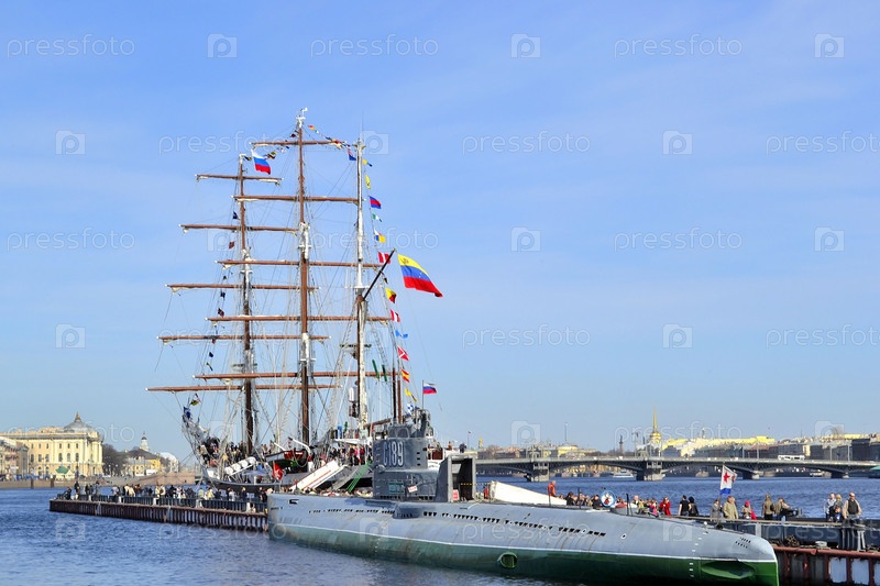 Парусное судно и подводная лодка в порту