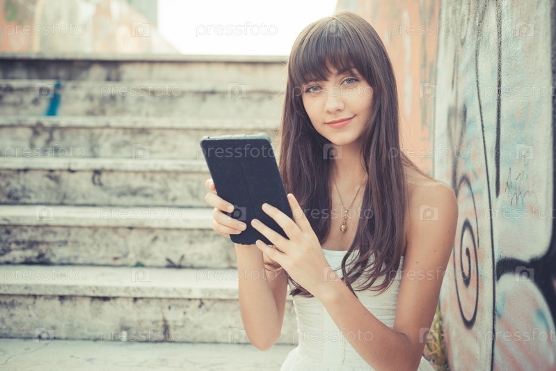 Молодая женщина в белом платье с планшетом